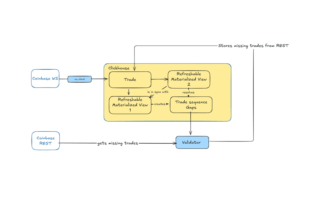 In this blog post, Dmitry Prokofyev, CTO of Koinju, describes a novel solution using only ClickHouse to detect and automatically remediate missing trades from Coinbase. The architecture combines three ClickHouse features to create a self-healing system: Refreshable Materialized Views for detection, a separate validation service for REST API backfilling, and ReplacingMergeTree for automatic deduplication of resolved gaps.