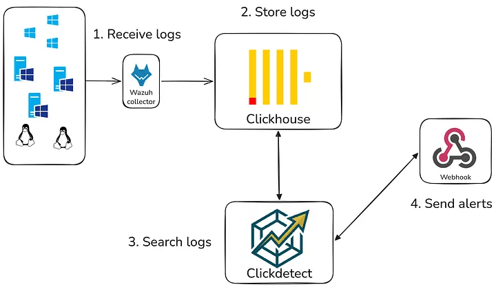 From there, Clickdetect schedules detections and fires alerts to a webhook — giving you a lightweight, cost-effective SIEM that scales from a single node to a distributed ClickHouse cluster.