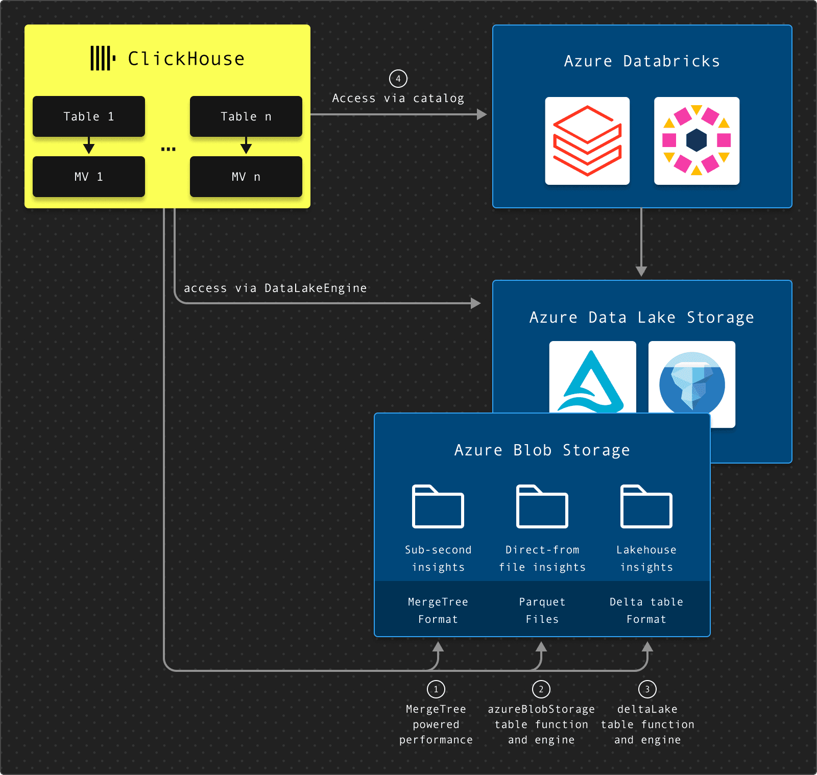 Already available in open source and coming to the Azure managed service soon, the ④ Unity Catalog integration will drastically simplify your experience using ClickHouse and Databricks as a joint data platform, with Databricks providing data lake management at scale and ClickHouse powering real-time analytics queries on top of that data. Once you connect ClickHouse to the Unity Catalog, you can seamlessly discover tables and securely query the data in your Databricks ecosystem. ee our guide for more).