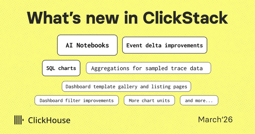 The last layer I added was infrastructure observability via ClickStack. The application exports metrics, logs, and distributed traces through an OpenTelemetry collector into ClickHouse. ClickStack provides the dashboards, alerting, and session replay on top. This means I can see exactly what happens when a user loads a dashboard or asks a question to an agent: which API was called, how long the ClickHouse query took, whether the response was cached.