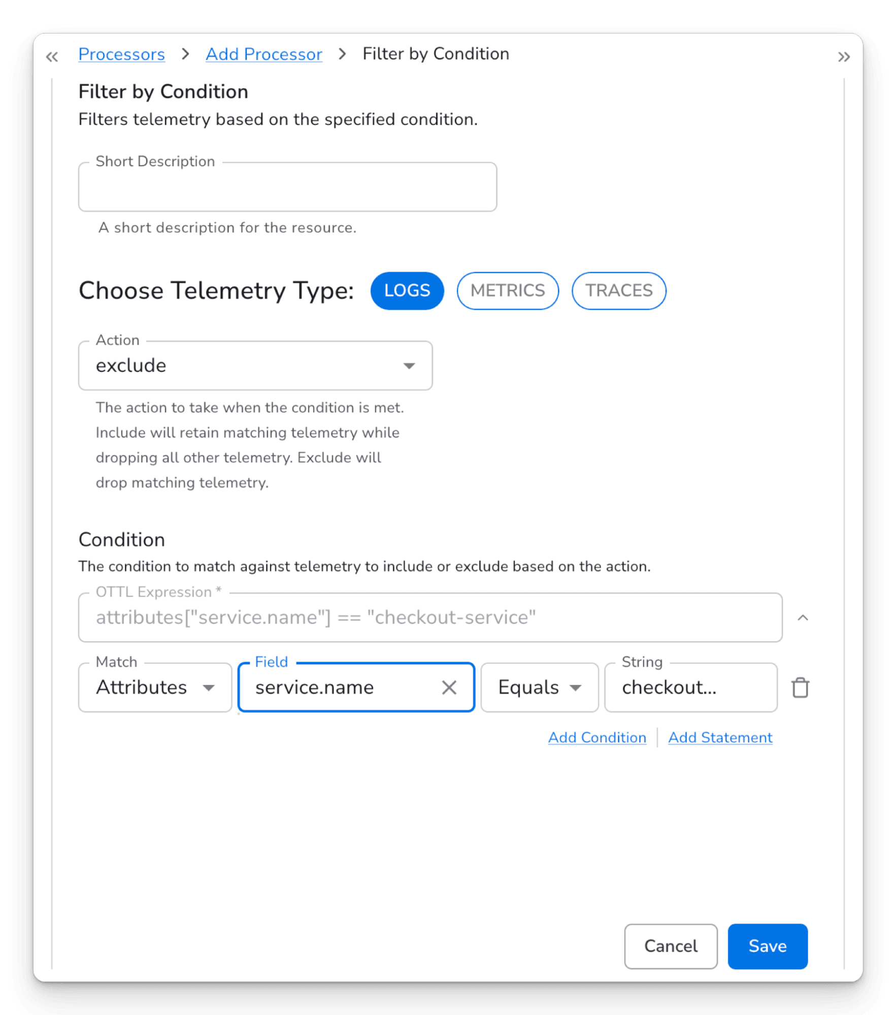 The Filter by Condition processor configuration showing the OTTL condition "severity_number < 13" with the action set to "Exclude" and telemetry type set to "Logs".