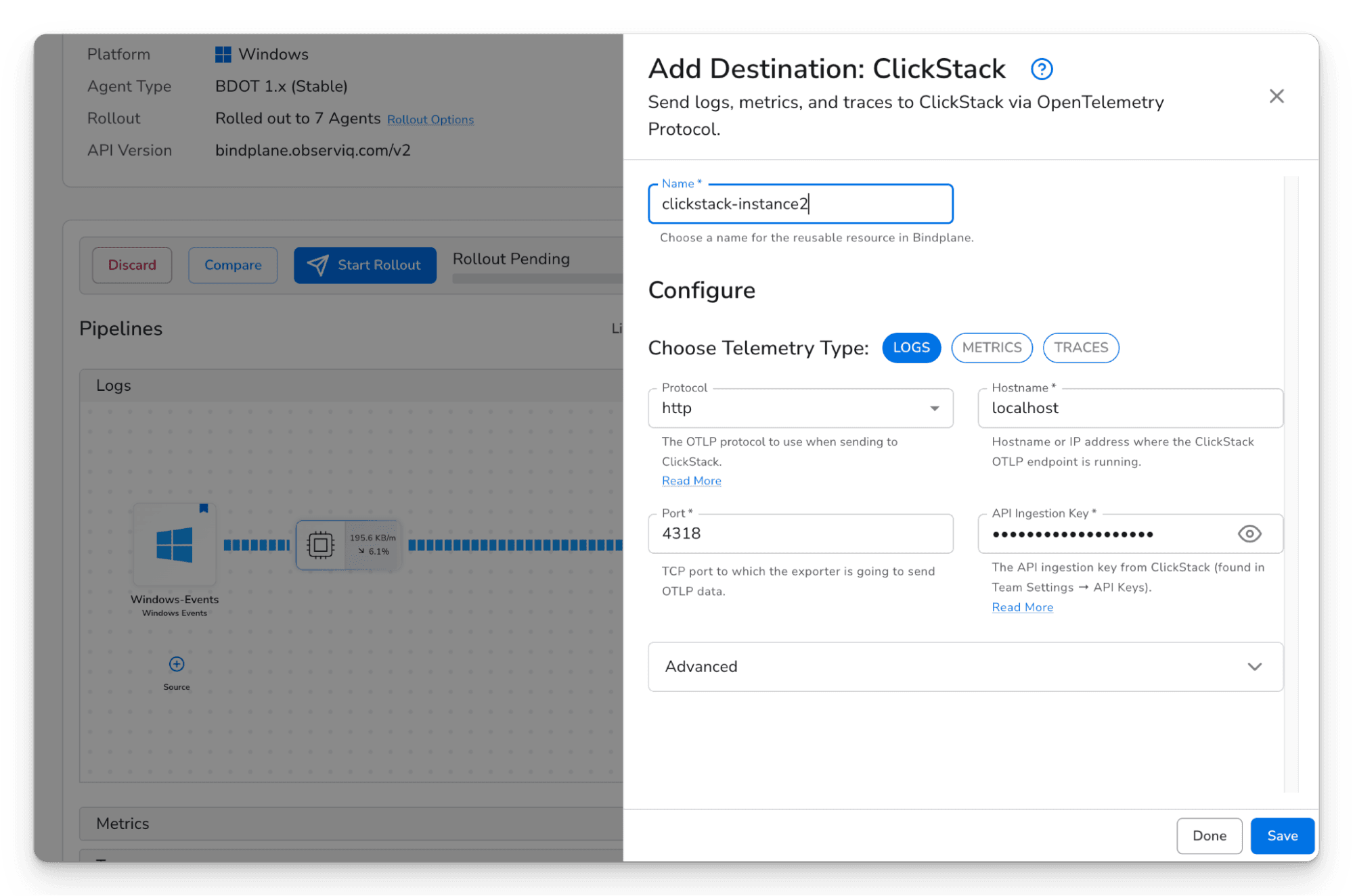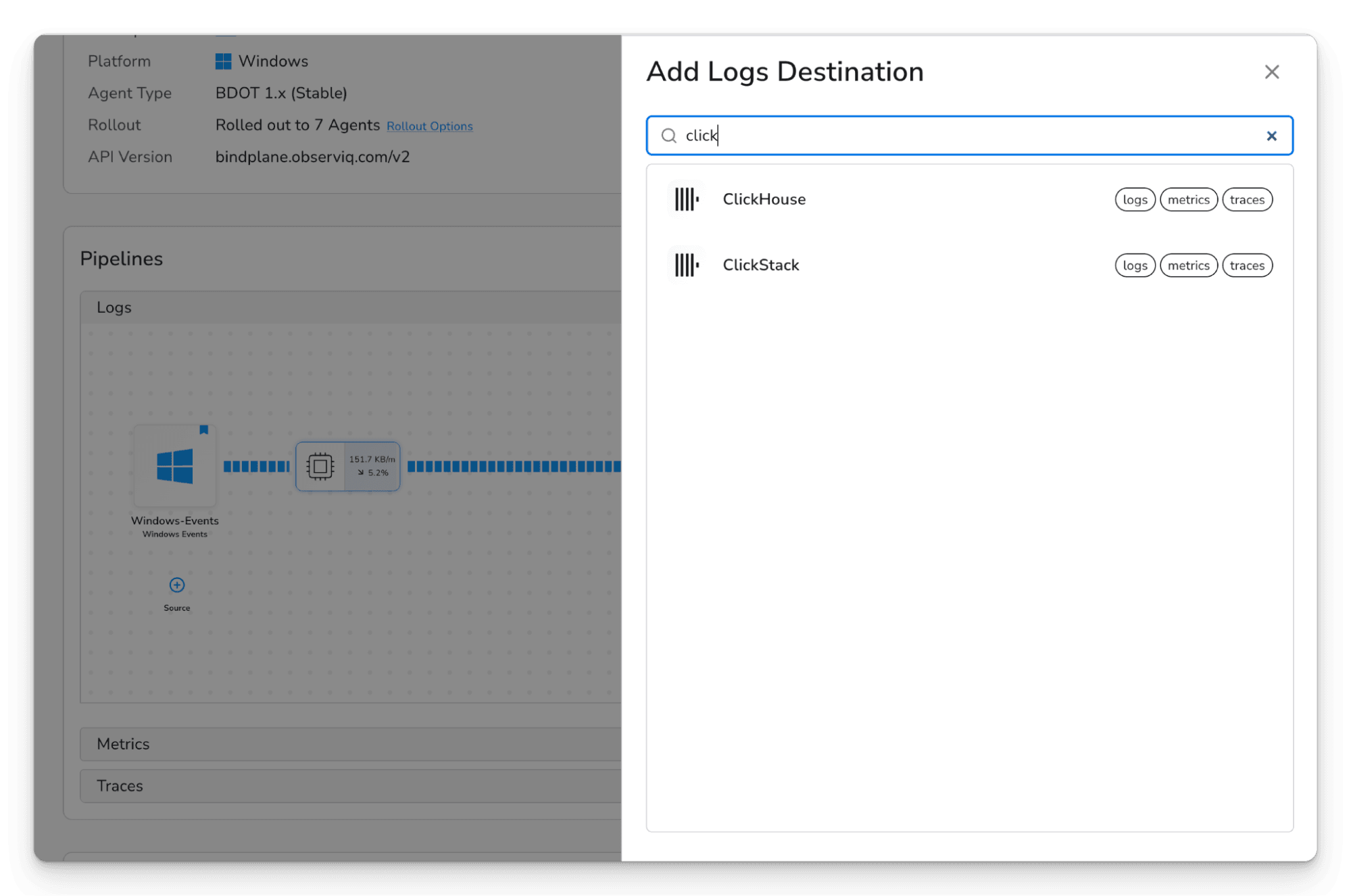 Here, we're going to get practical. If you already have telemetry pipelines running — shipping logs to Elasticsearch, metrics to Datadog, traces to Splunk — this post walks through how to add ClickStack alongside those existing destinations using Bindplane. No rip-and-replace required. You can start routing data to ClickStack today, evaluate it against what you're already using, and migrate at your own pace.