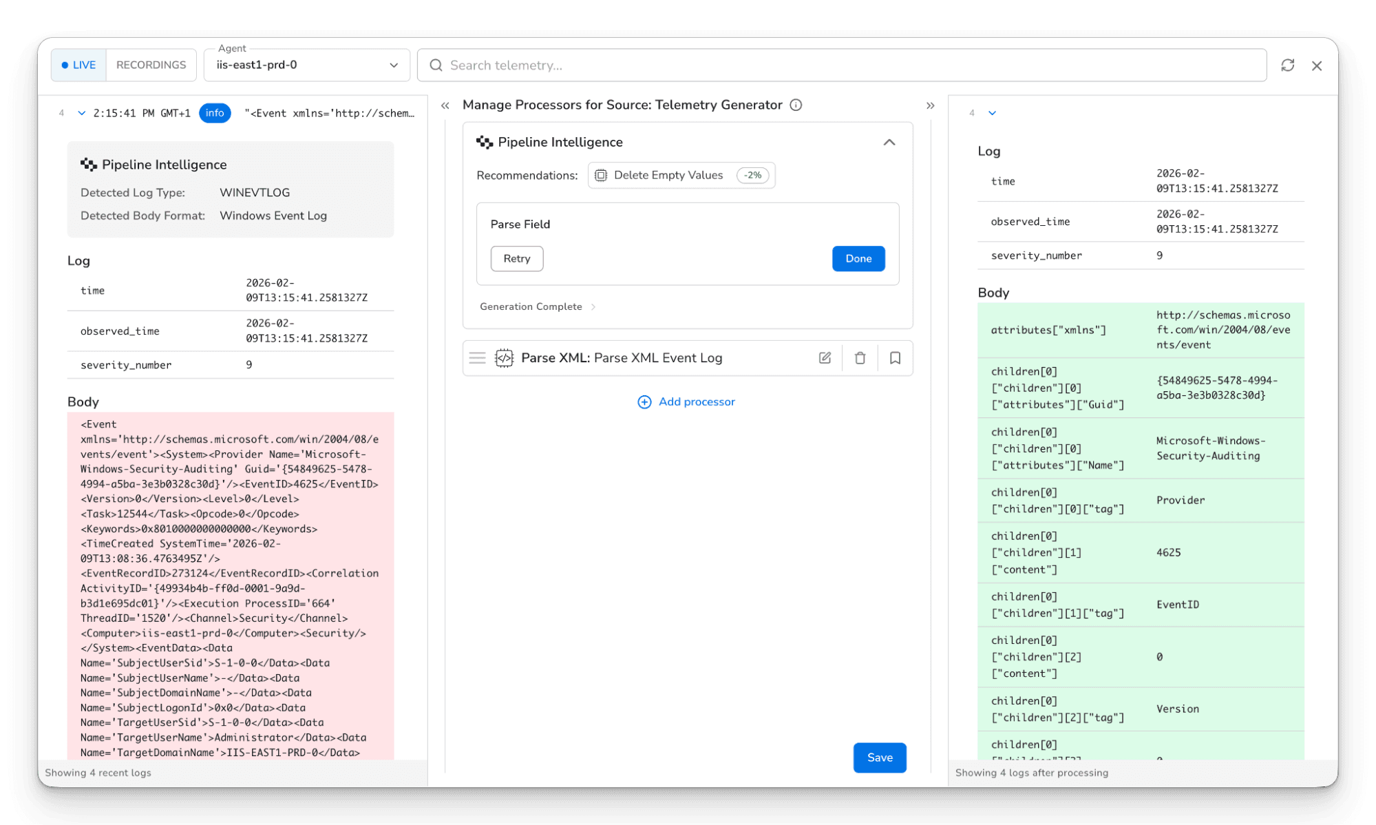 Bindplane’s blueprints come with pre-built configurations that automatically normalize log formats, extract structure, enrich records with resource attributes, and drop fields that increase storage cost without adding analytical value.