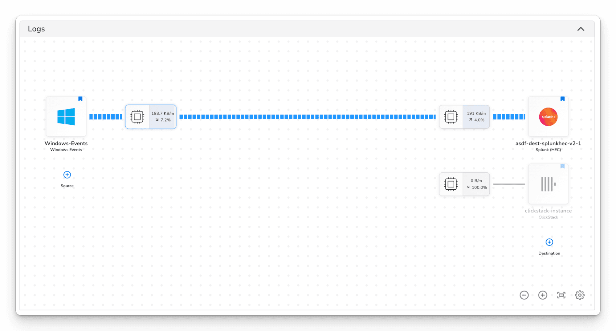 The Bindplane topology view showing the source pipeline connected to the original destination (e.g., Splunk HEC, showing active throughput), and the ClickStack destination sitting below it disconnected, showing 0 B/m and 100% reduction. This is the state immediately after adding the destination.