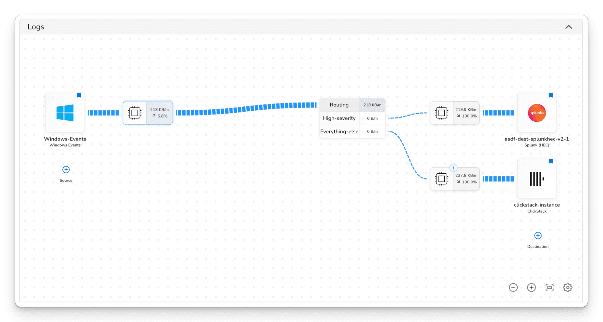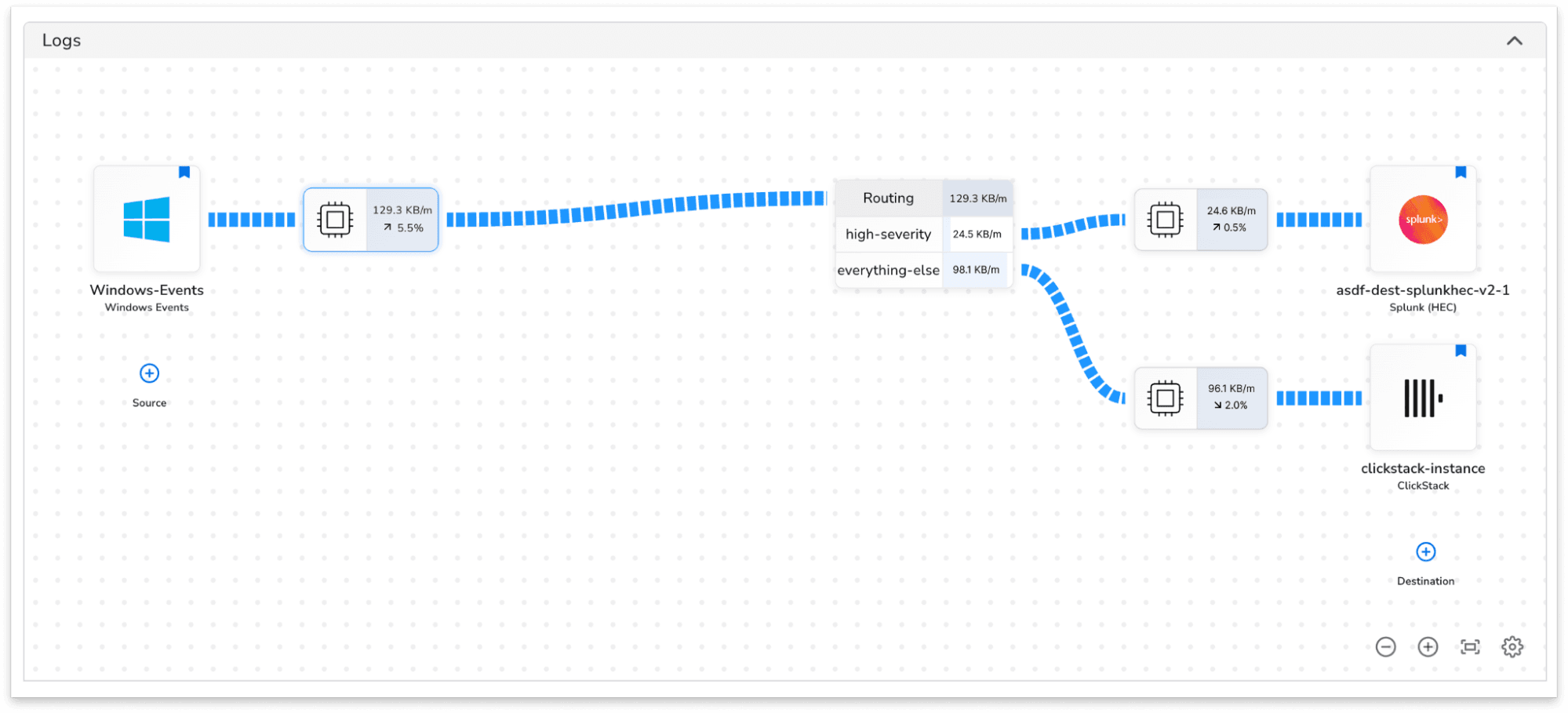 A common pattern is to route WARN, ERROR, and FATAL logs to your existing destination, with a catch-all route that sends everything else to ClickStack. Your legacy platform keeps the high-severity logs that feed your alerting rules and on-call workflows. ClickStack gets the rest, giving your team full visibility into debug and info logs without the cost pressure.