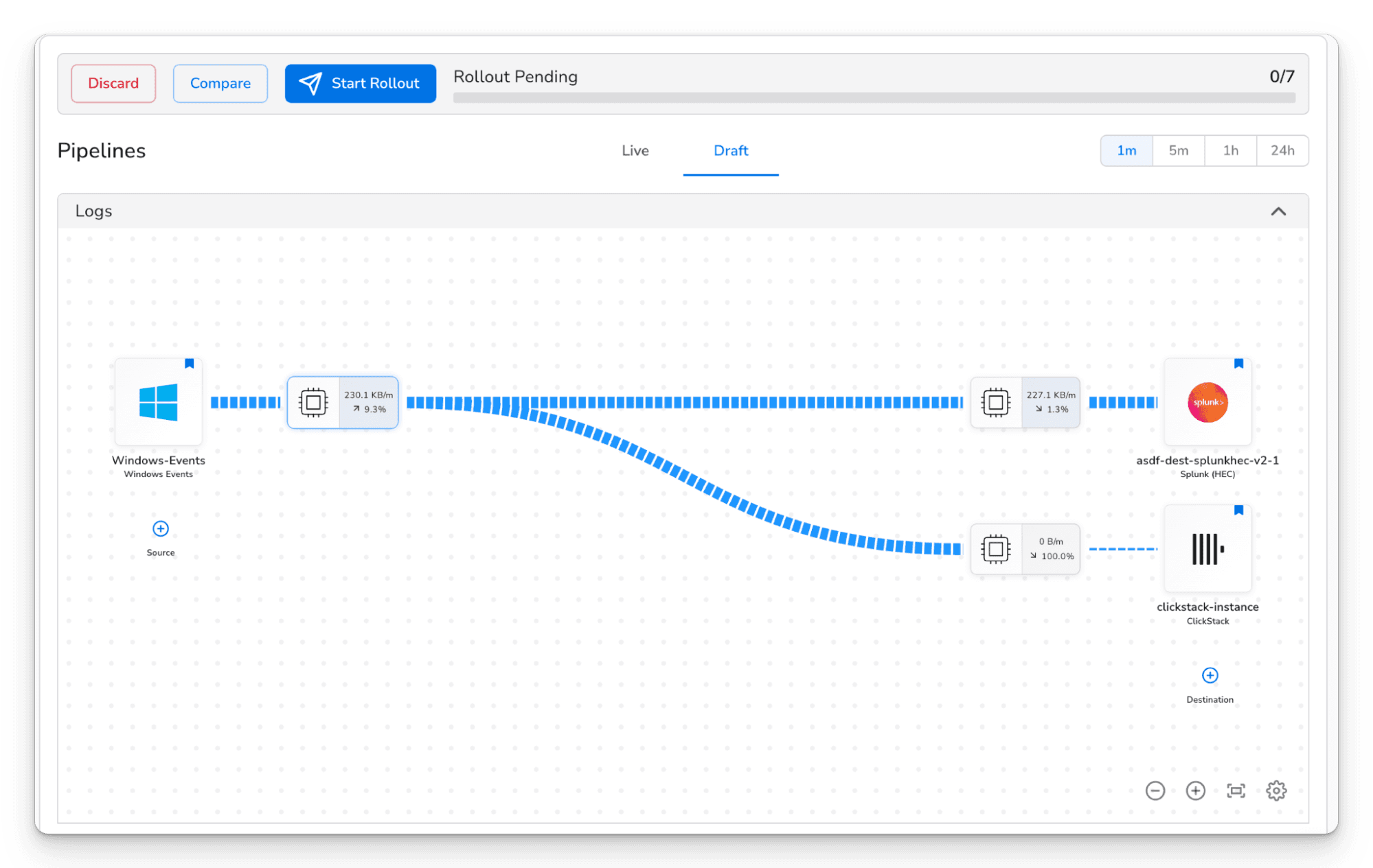 This is a good opportunity to add processors that shape your data for ClickStack before rolling out. We'll cover that more in the blueprint section below, but even at this stage you can add destination-level processors on the ClickStack path to filter, enrich, or transform data independently of what gets sent to your other destination.