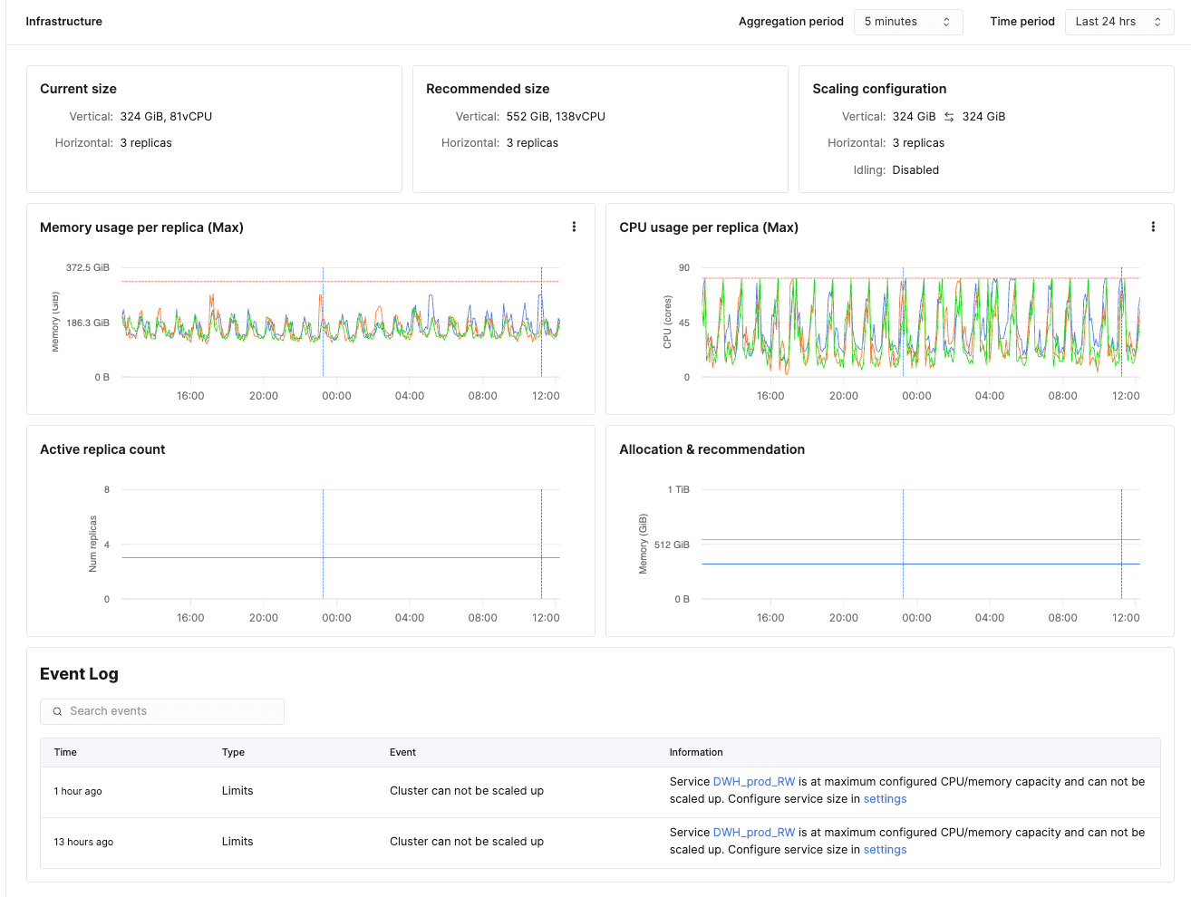 The new Infrastructure page gives administrators a clearer view into how their services are scaling over time. CPU and Memory utilization metrics, now with additional aggregation types, show how much utilization your ClickHouse cluster is getting.