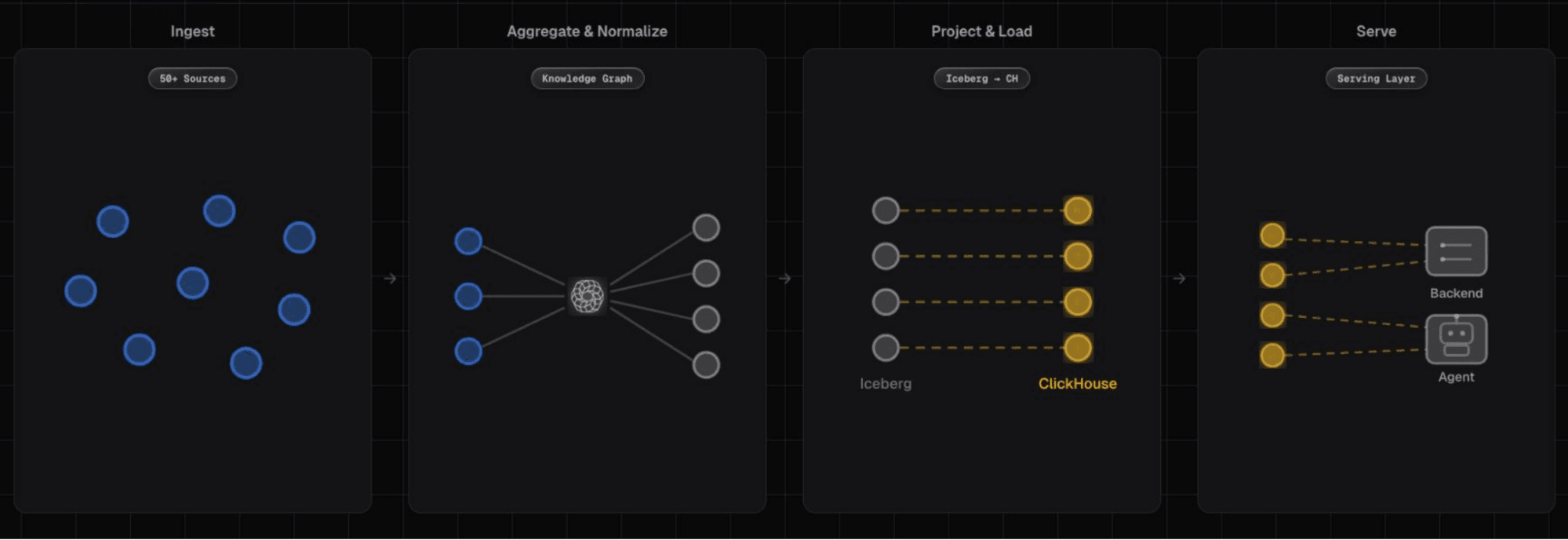 From there, dbt projects denormalized tables into Iceberg—pre-joined, pre-aggregated views of the Knowledge Graph. Those projections are then loaded into ClickHouse via the ClickHouse Spark Connector, which provides cheap, tunable, and highly scalable compute for the load path. All table schema and layout decisions are defined using the ClickHouse dbt library.