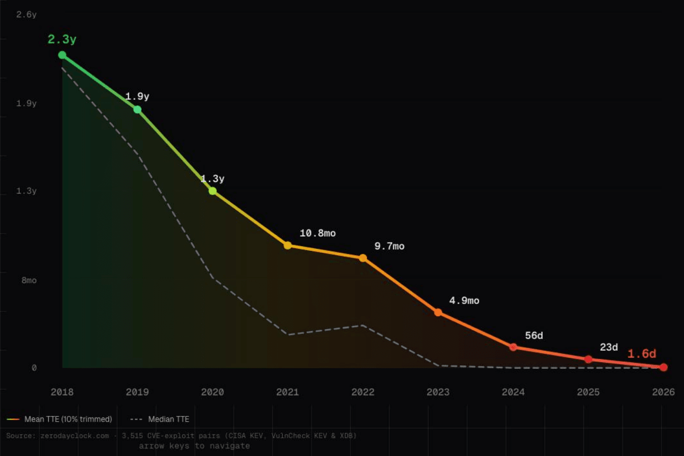 Since 2018, mean time-to-exploit (TTE) has dropped from 2.3 years to 1.6 days.