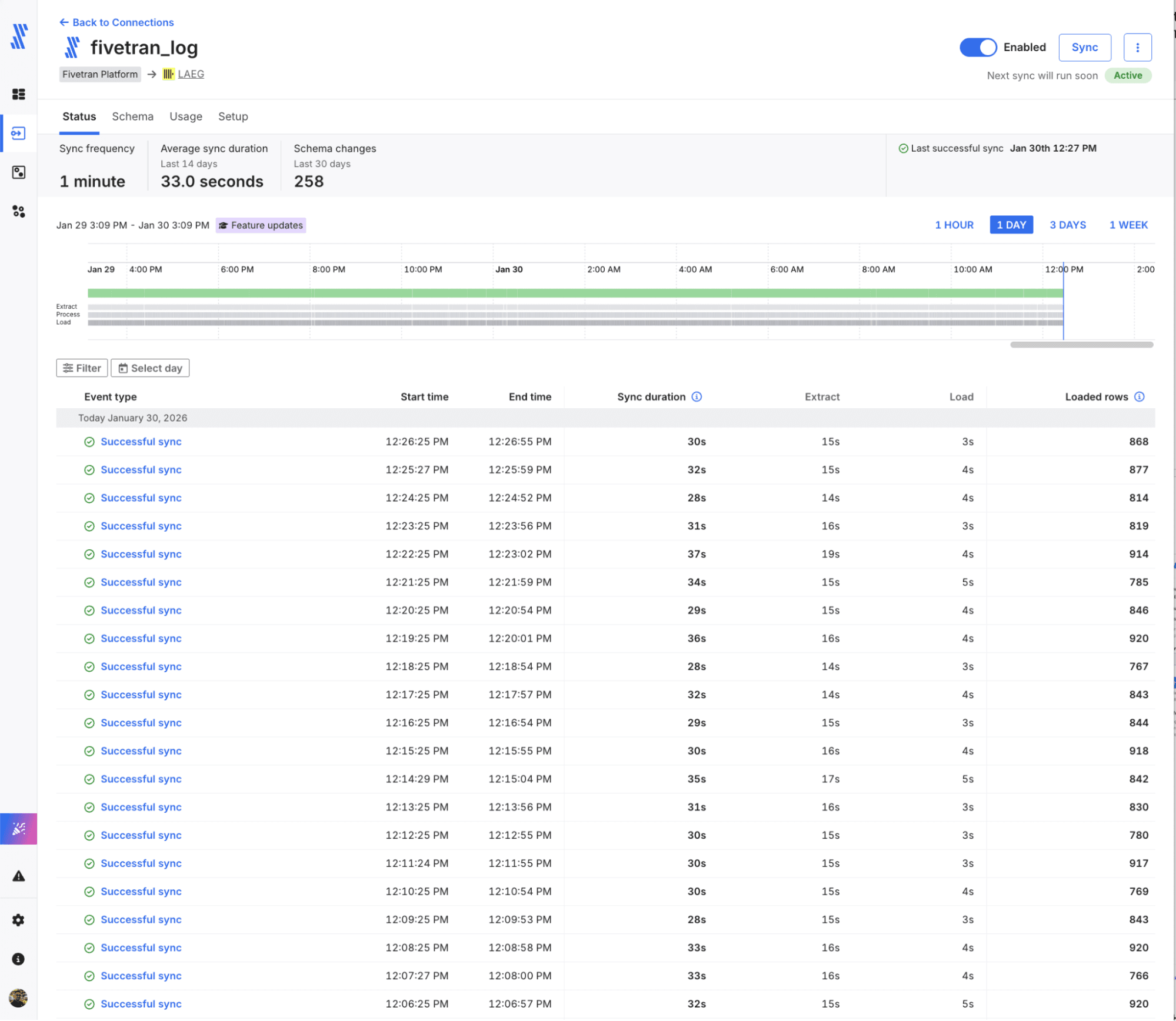 Once you’ve saved and tested the connection, you’ll be taken to the connection screen showing the history of when the connector has run and metadata containing the run details (e.g. loaded rows and performance timings).