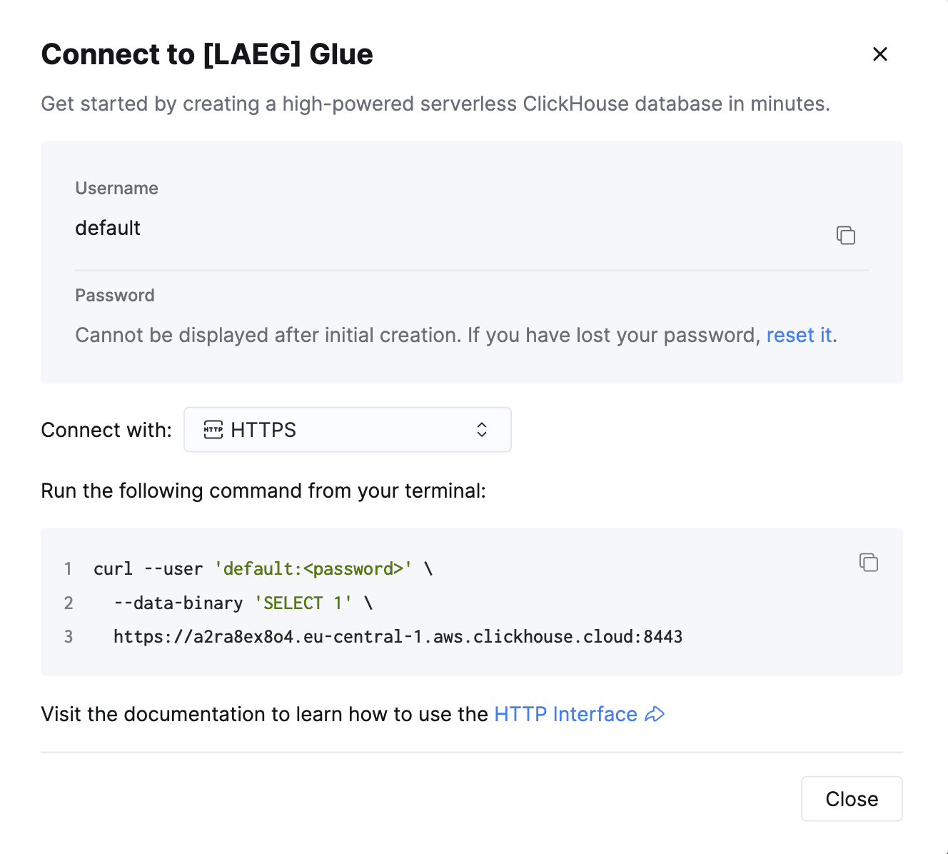 Using the host details from the connect modal for your service, you’ll need to provide the URI without the protocol. If you’re connecting to ClickHouse cloud, leave the port at the default 9440.