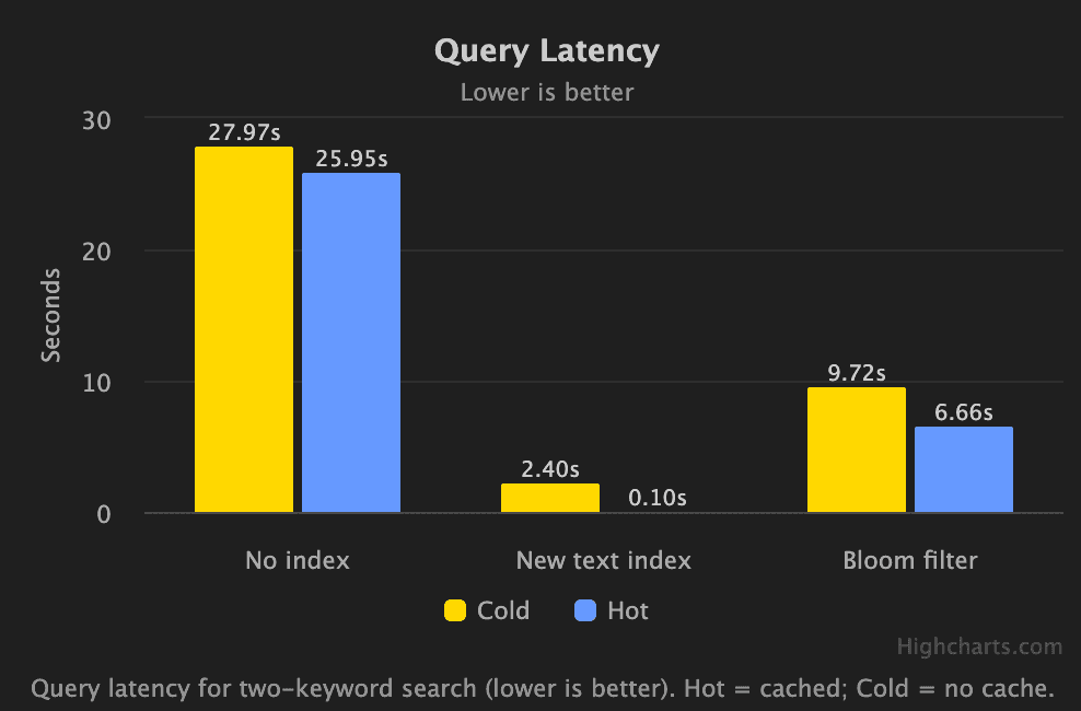 As shown above, the performance gains from Full-text Search can be dramatic. While the example focused on a single term over a single dataset, and individual results will vary by workload, we consistently see meaningful improvements. For most real-world search queries, users can expect 7 to 10x faster performance for cold queries and even more for hot.