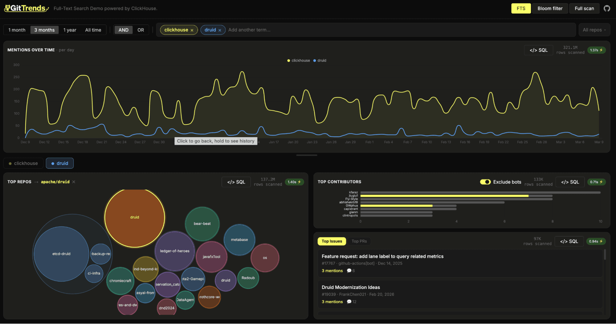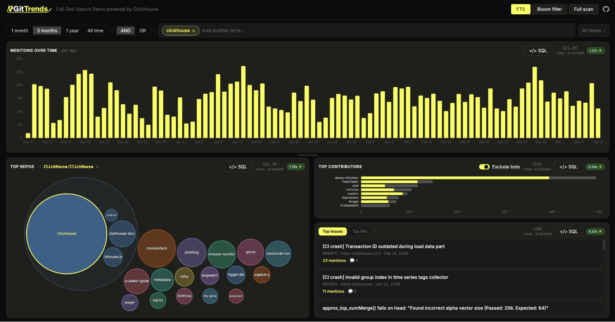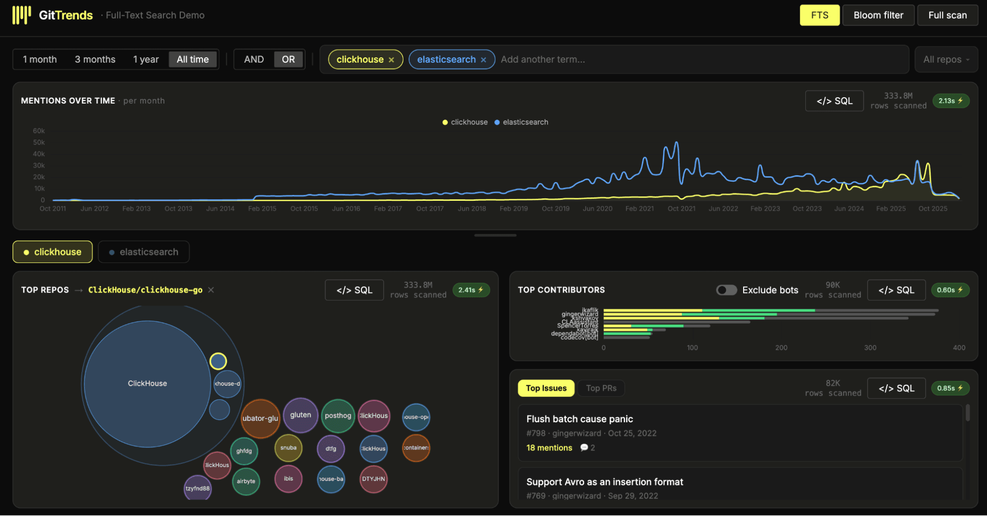 One question we can now answer quickly is: how often is "ClickHouse" mentioned across GitHub comments over time?