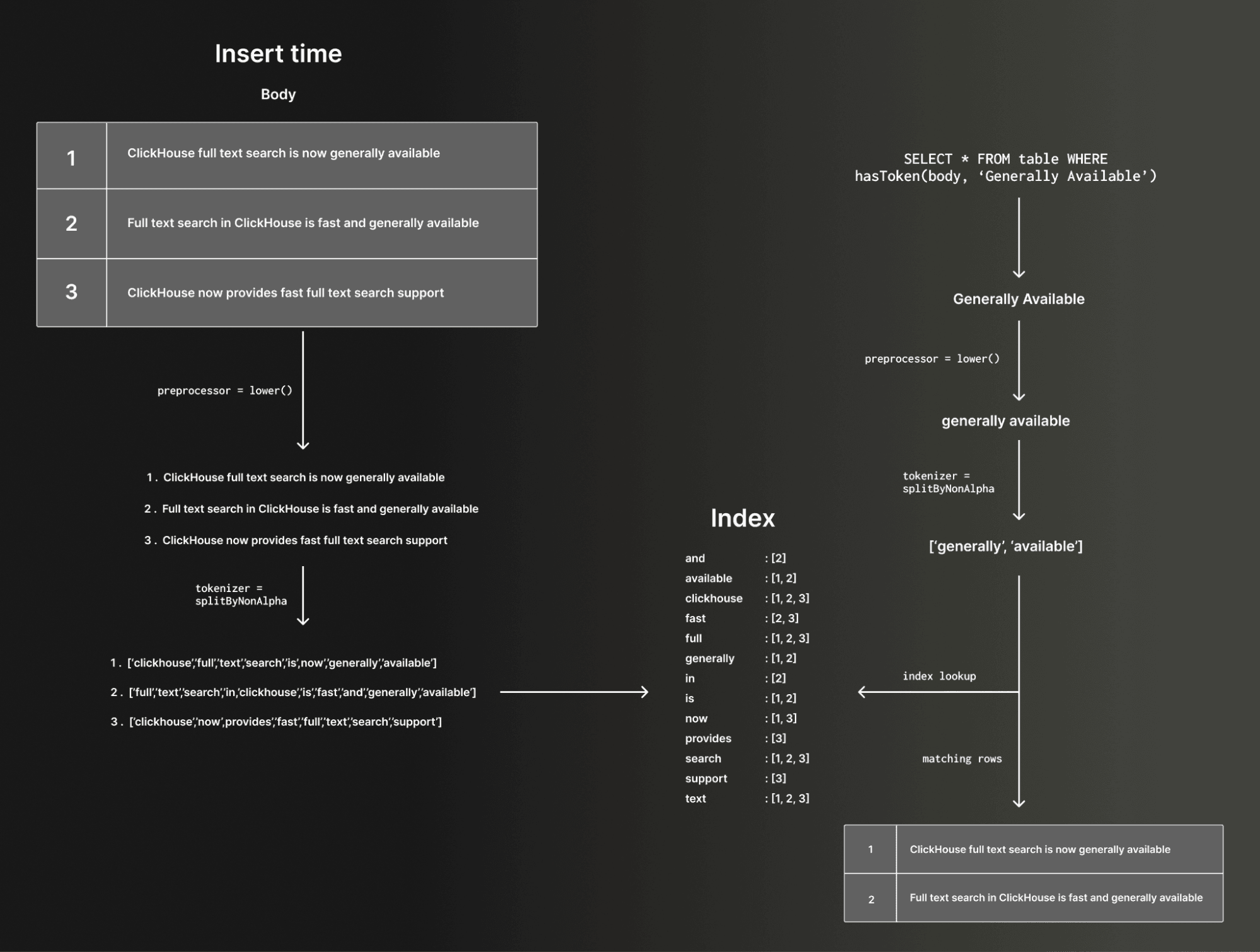 When a text index is defined on a column, this tokenization process is applied to the column's values at insert time (or when the index is materialized), and the resulting token-to-row mapping is stored internally. At query time, the same tokenization logic is applied to the search string. The inverted index is then used to efficiently identify candidate rows that contain the requested token or tokens.
