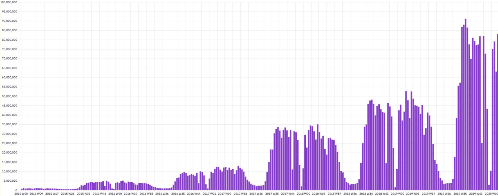 Kami’s weekly event volume grew steadily from 2015 to 2019