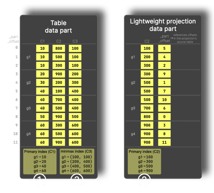 For filters on a column that is not part of the primary key, such as WHERE C2 > 900, ClickHouse can use a lightweight projection, which stores the sorted projection key (C2) values plus _part_offset values and provides its own primary index (②) that allows granules to be pruned for filters on the projection key.