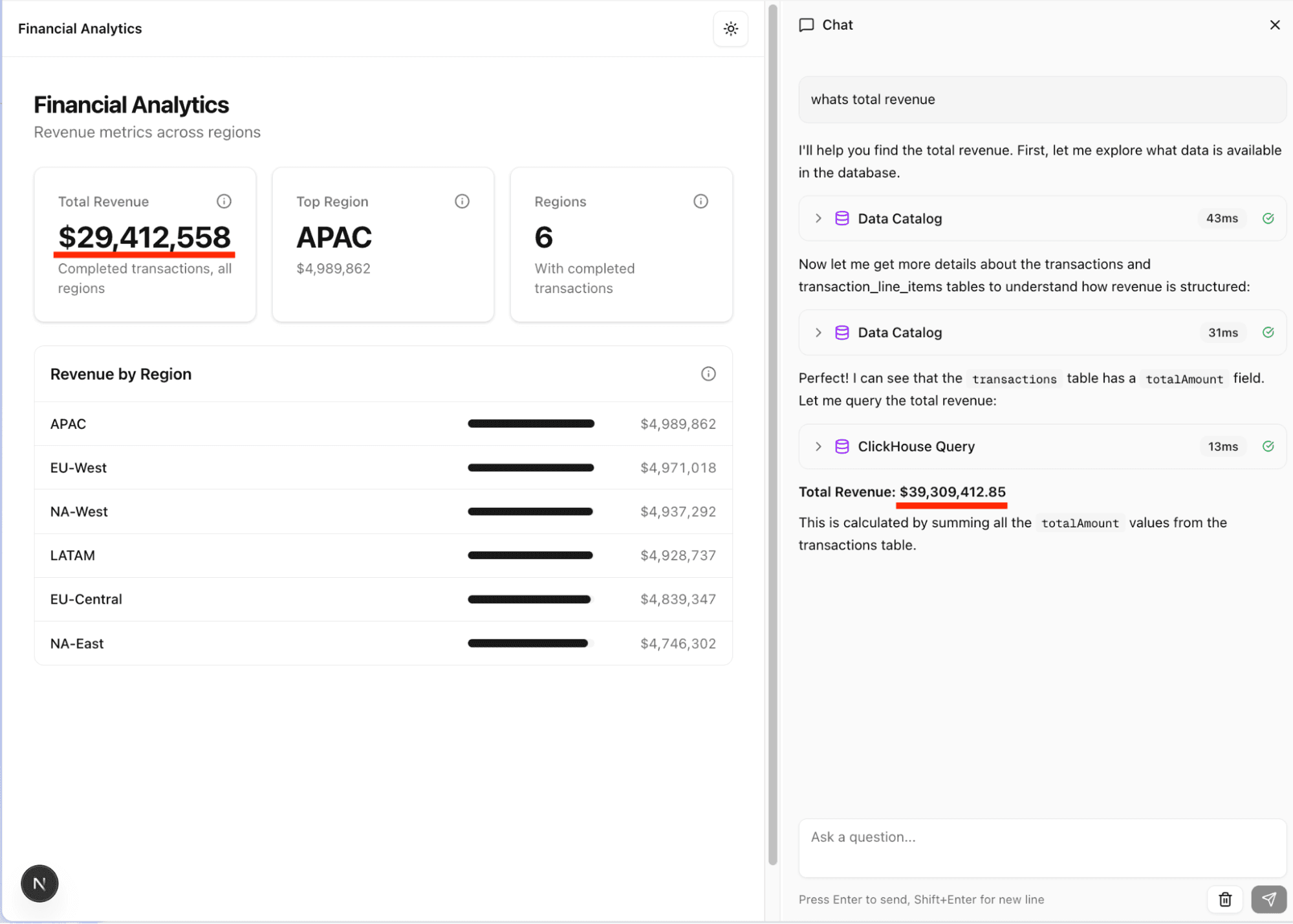 The below example is based on something we saw at one of our customers: their custom chat client vibe-SQLed a definition of revenue that made sense (sum of amount), but didn’t exclude transactions that were incomplete (Figure A: chat overstates revenue). That kind of mistake becomes impossible with a well-defined metrics layer (Figure B: chat matches actual revenue).