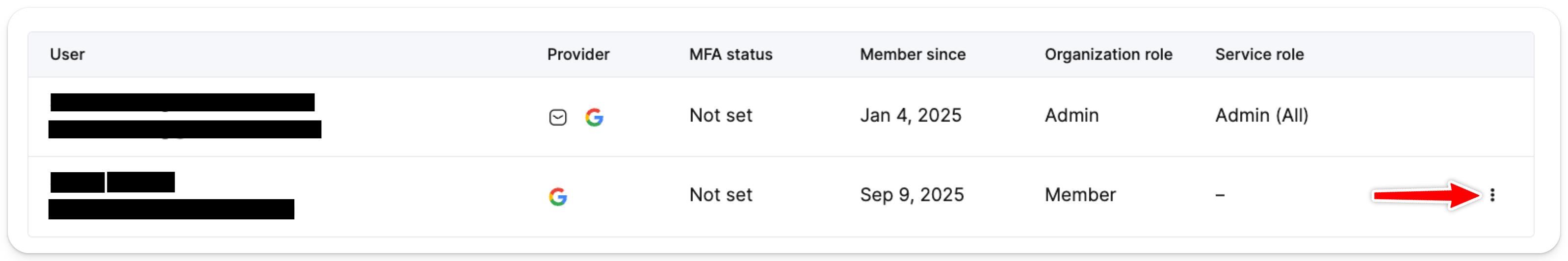 Users and roles를 클릭합니다.- 사용자 이름 옆의 점 세 개 아이콘을 클릭한 후