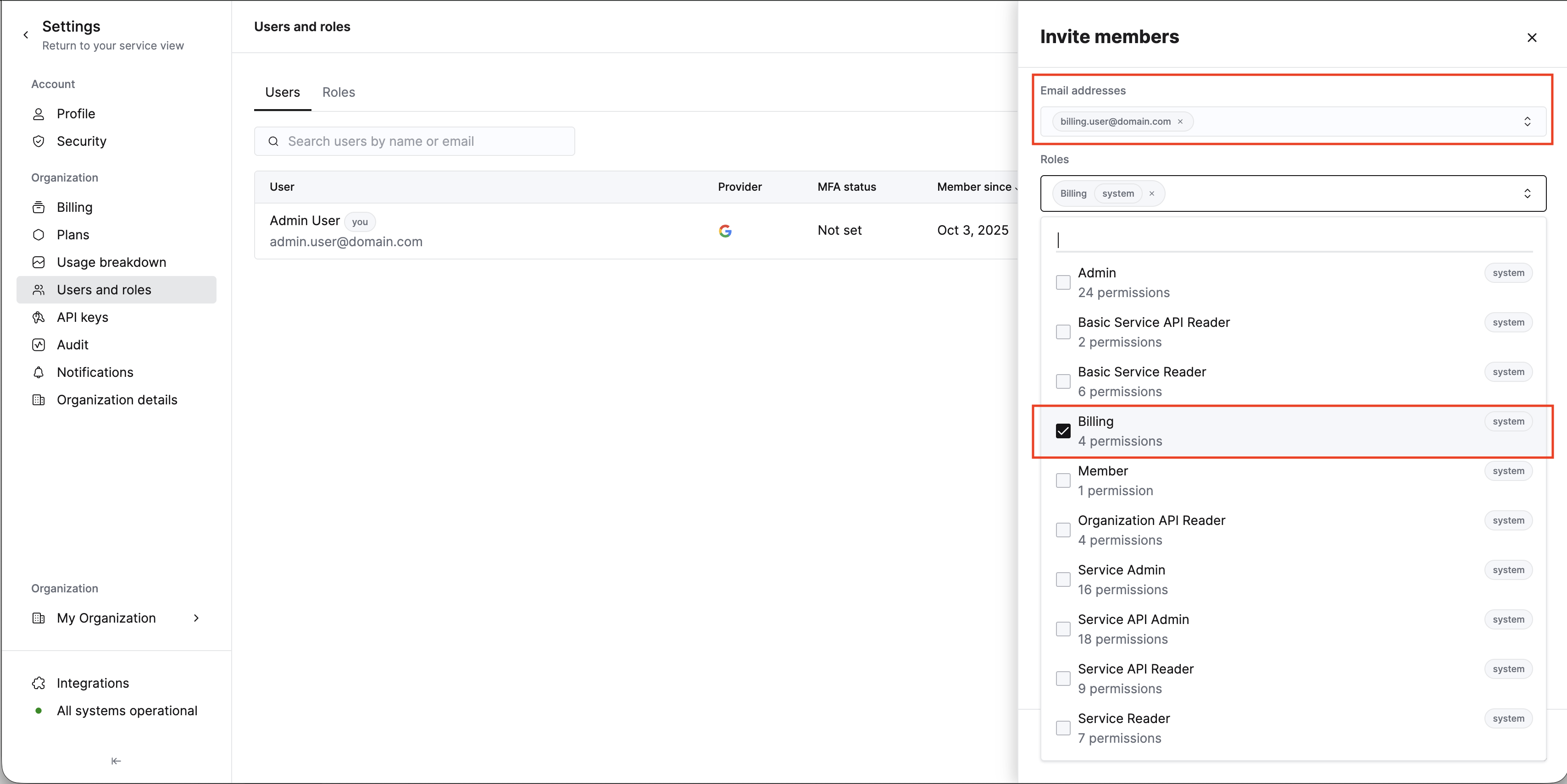 На странице сервисов выберите имя своей организации. Во всплывающем меню выберите пункт Users and roles.