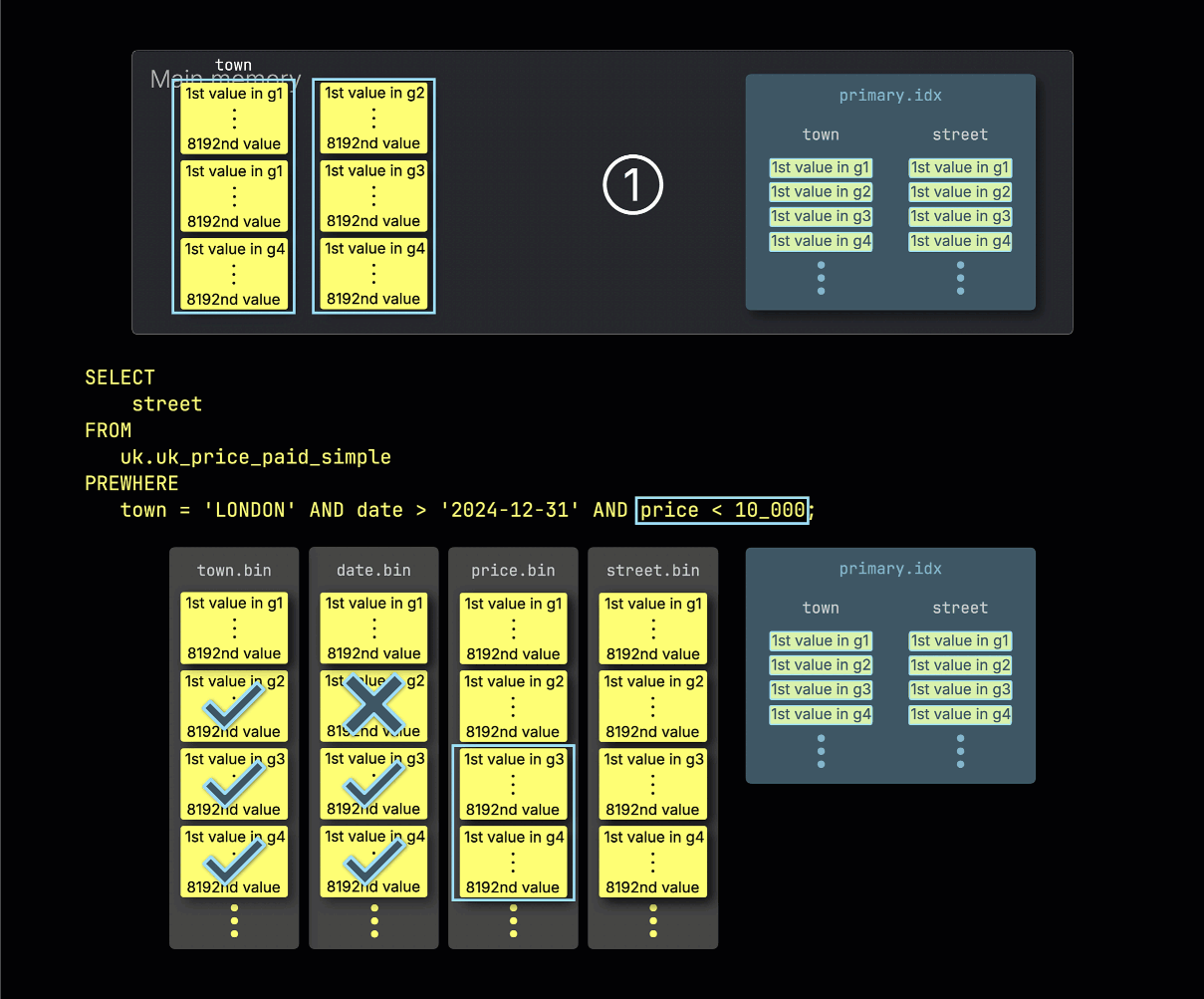 下列动画展示了在将 PREWHERE 子句应用到所有查询谓词后,上文中的查询是如何被处理的。