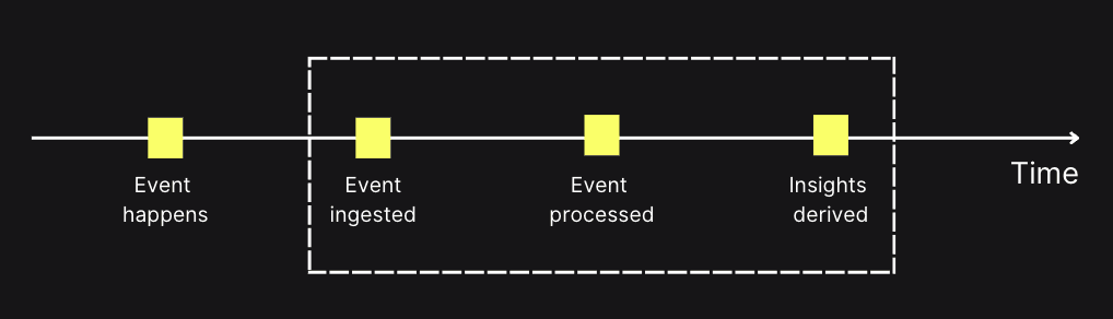 When comparing real-time analytics with batch analytics, the key difference is latency i.e. how long it takes from when an event happens until you gain insight from it.