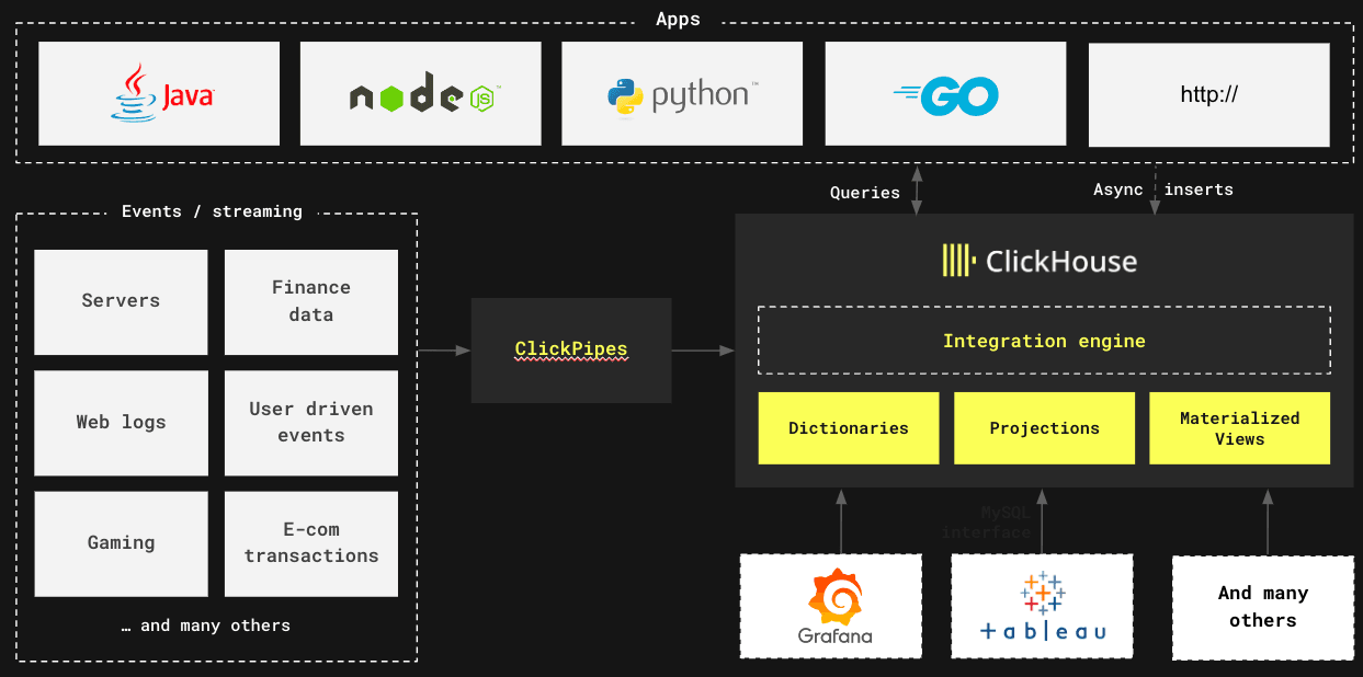 It can comfortably ingest hundreds of thousands and even millions of records per second. Cloudflare was ingesting 6 million records per second as far back as 2018. It can also ingest data from an extensive range of sources. ClickPipes provides enterprise-grade support for ingesting data from Confluent Cloud, Amazo S3, Azure EventHubs, and more. In addition, ClickHouse also has integrations with Apache Iceberg, MongoDB, MySQL, AirByte, and more.